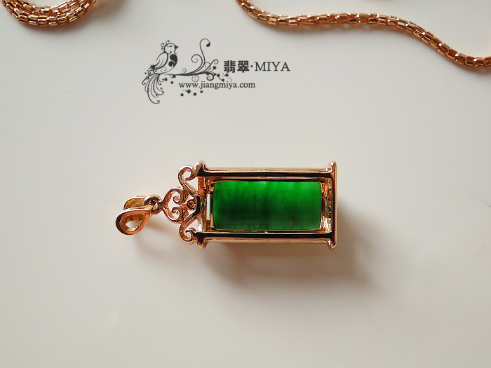 蛋面是极品花青料,不带一些黑花的,整体都是绿绿的感觉,镶嵌18k玫瑰金钻石,整体感很时尚精致。