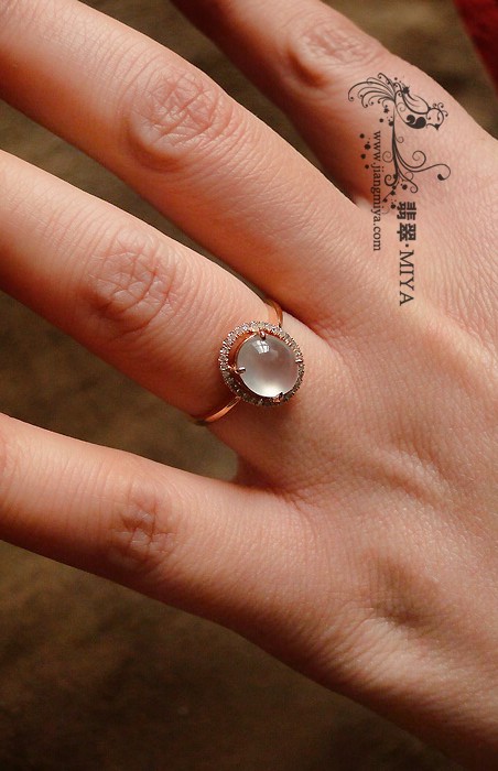 这一枚马鞍戒,男女都可以佩戴,蛋面为冰种,水水润润,浅绿色,整体给人很宁静的感觉,镶嵌18k白金钻石。
