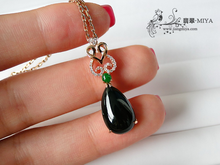 18k玫瑰金钻石镶嵌墨翠水滴吊坠