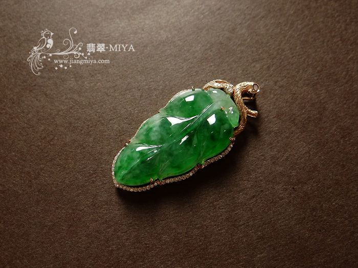 3号:18k玫瑰金钻石镶嵌冰种飘绿花翡翠叶子吊坠