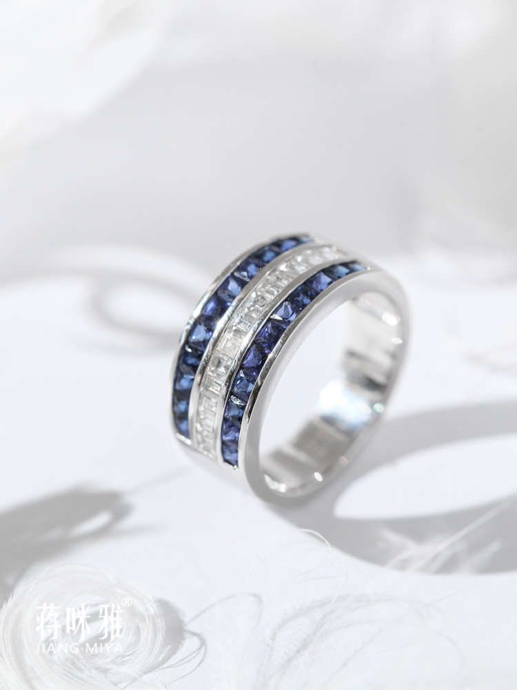 这是一枚男女皆可佩戴的蓝宝石排戒,当我拿在手里的时候,就感觉质感很棒,甚至,
