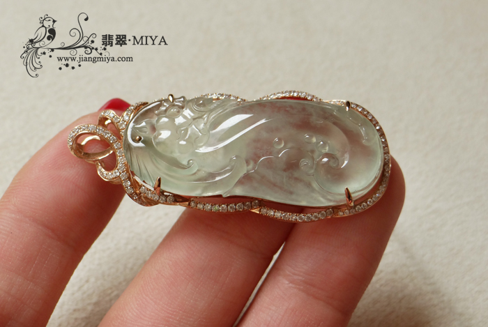 高冰荧光草龙镶嵌18k玫瑰金钻石翡翠挂件