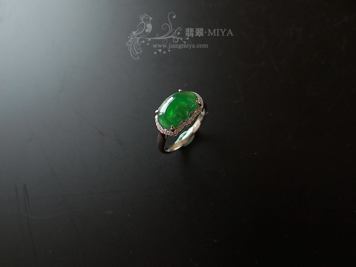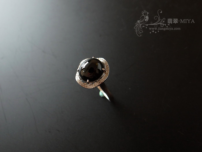 4号:18k白金钻石镶嵌黝黑墨翠蛋面戒指