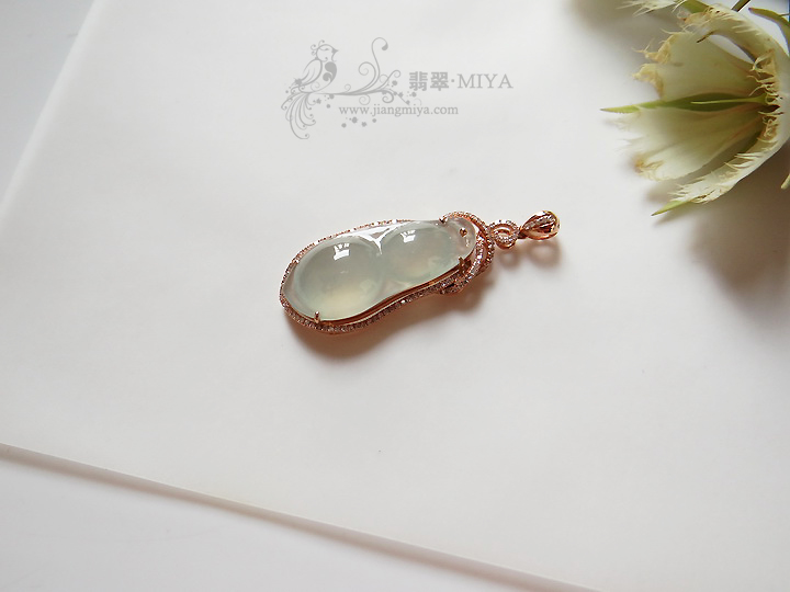 冰种,豆荚,通透,水润,完美,无裂纹,18k玫瑰金钻石围镶。