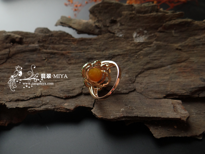 冰红黄翡,颜色略糖红色,完美,无裂纹,少棉,佩戴效果不错。搭配的k金钻石,翠榴石。