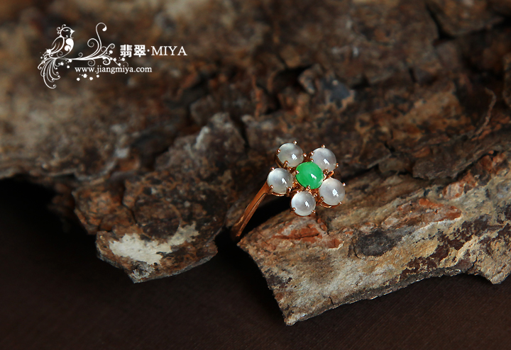 18k白金钻石镶,搭配冰红小水滴戒面,以及莹绿小翡翠蛋面一枚;佩戴效果抢眼夺目,少见的高品质红翡。
