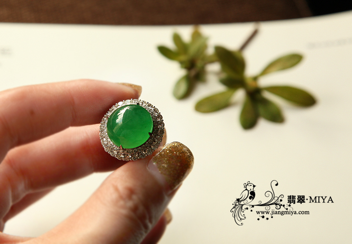 1号:冰种正阳绿翡翠蛋面镶嵌戒指1,偏正圆形