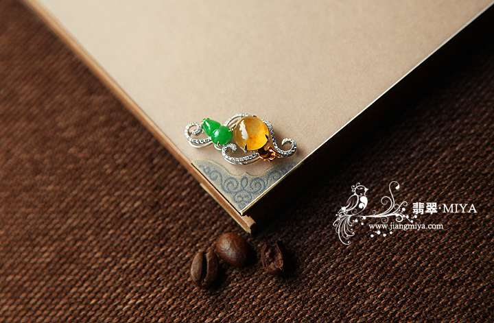 18k白金钻石镶嵌,翠绿葫芦内部有纹线,黄翡蛋面无裂纹;