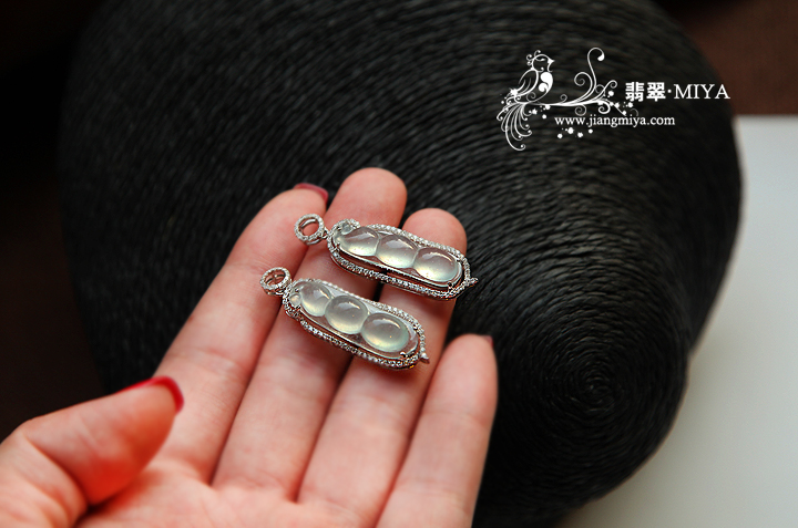 冰种翡翠四季豆,搭配18k白金钻石翡翠扣头,豆子为高冰种,起荧光,通透无裂。