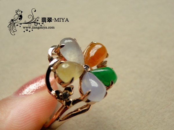 18K玫瑰金钻石镶嵌五彩翡翠戒指