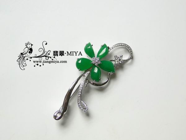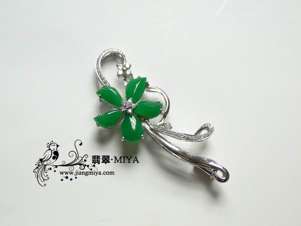 宝贝1:冰糯种满色正阳绿翡翠镶嵌18K白金钻石翡翠胸针“绽放的青春”