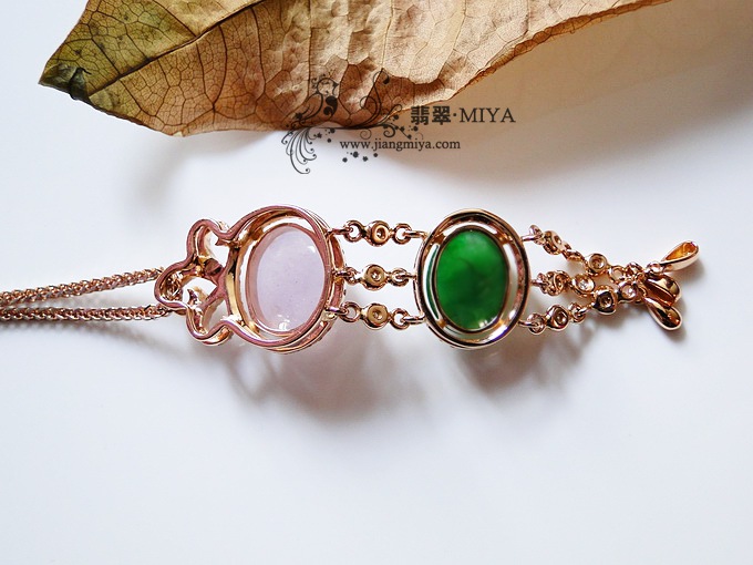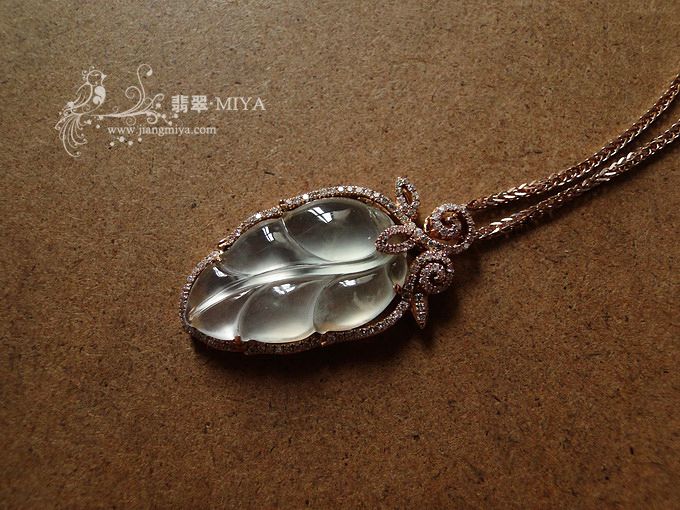 冰种,起荧光,叶子比较小巧可爱,镶嵌18K玫瑰金钻石,小叶子透光看有一条竖向小细纹,刮不到。