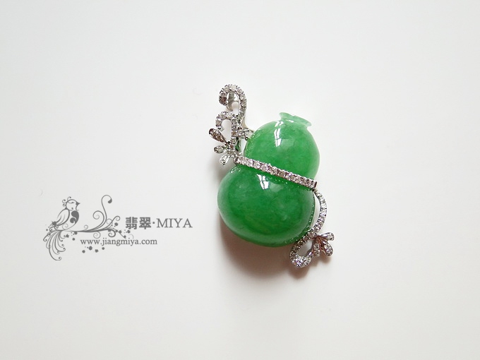 冰种,满绿翠绿,雕刻为横向如意,镶嵌18K白金钻石,效果很精美,适合搭配项圈,戴在锁骨位置很美貌。