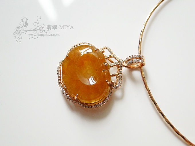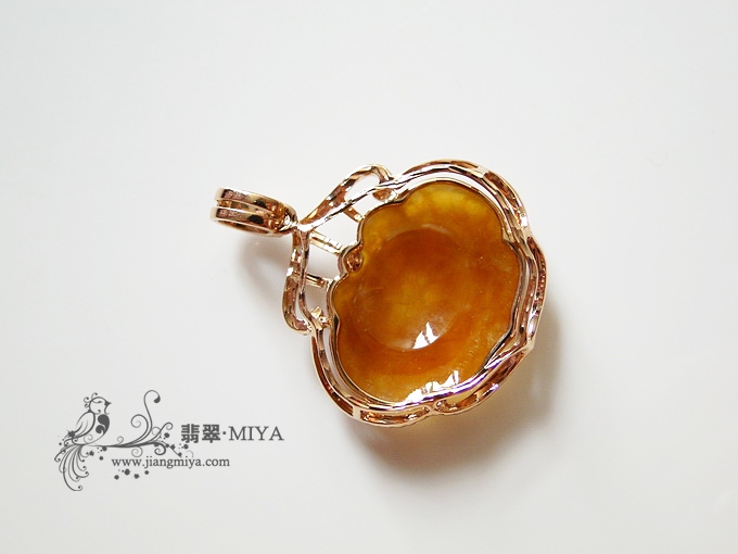 很少见到这么通透水润的黄翡,款式为横向如意,比较古典,镶嵌18K玫瑰金钻石,整体很精致,皮肤白的,,