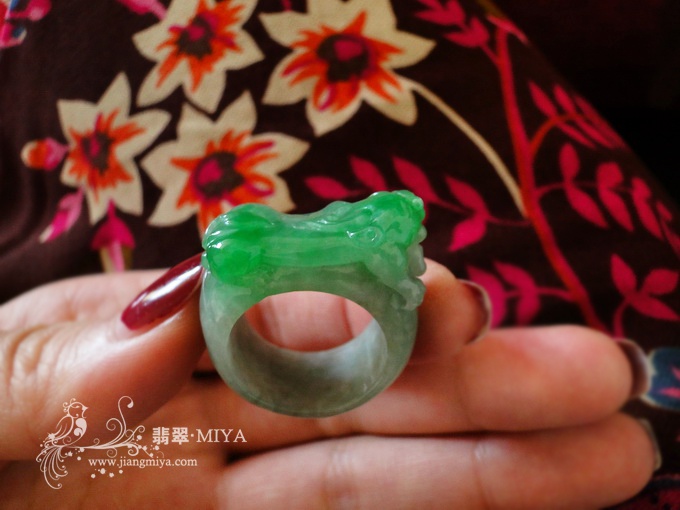 这一枚貔貅扳指,正面比较漂亮,带有翠绿色,特别是貔貅的头和尾部,